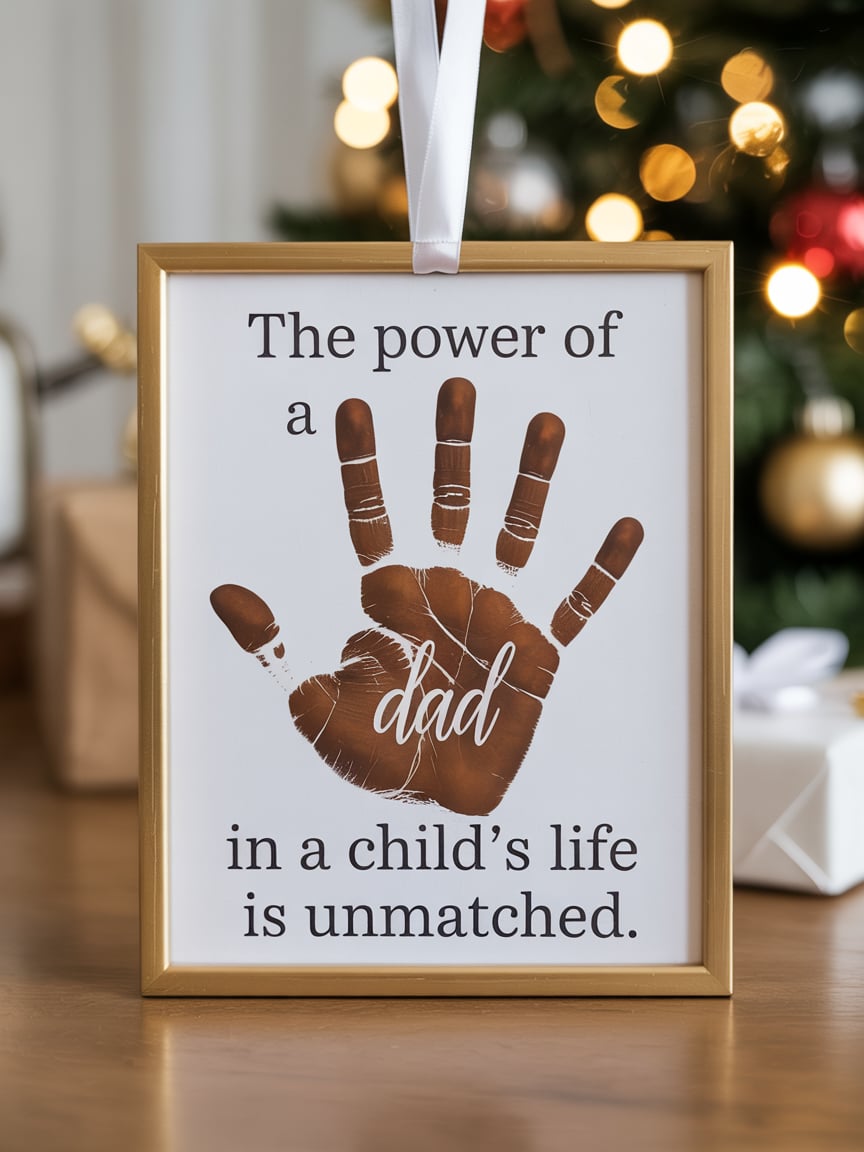 Keepsakes and practical wins: a baby handprint ornament kit, a personalized mug, or a DIY new dad survival kit filled with snacks and caffeine.