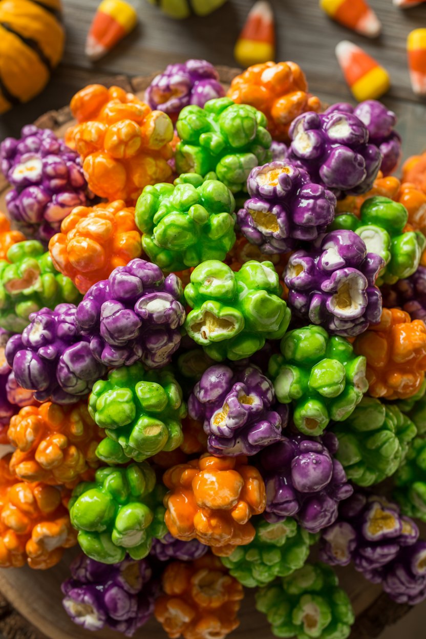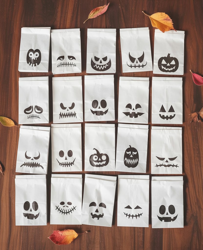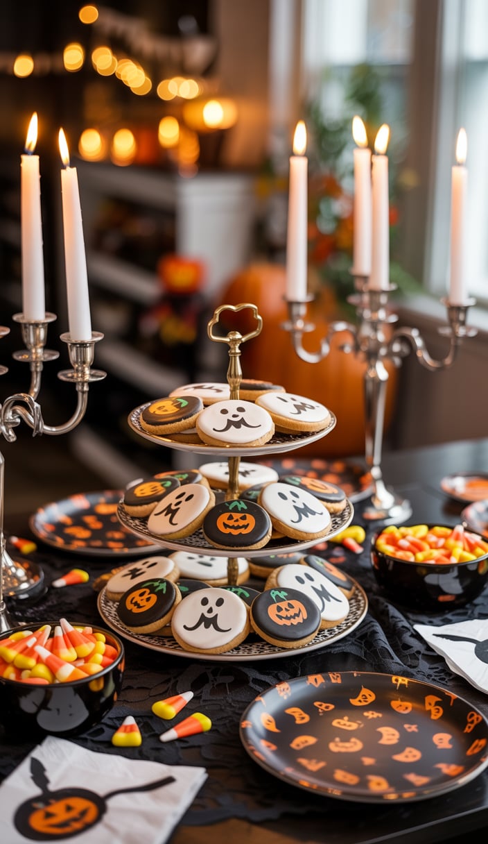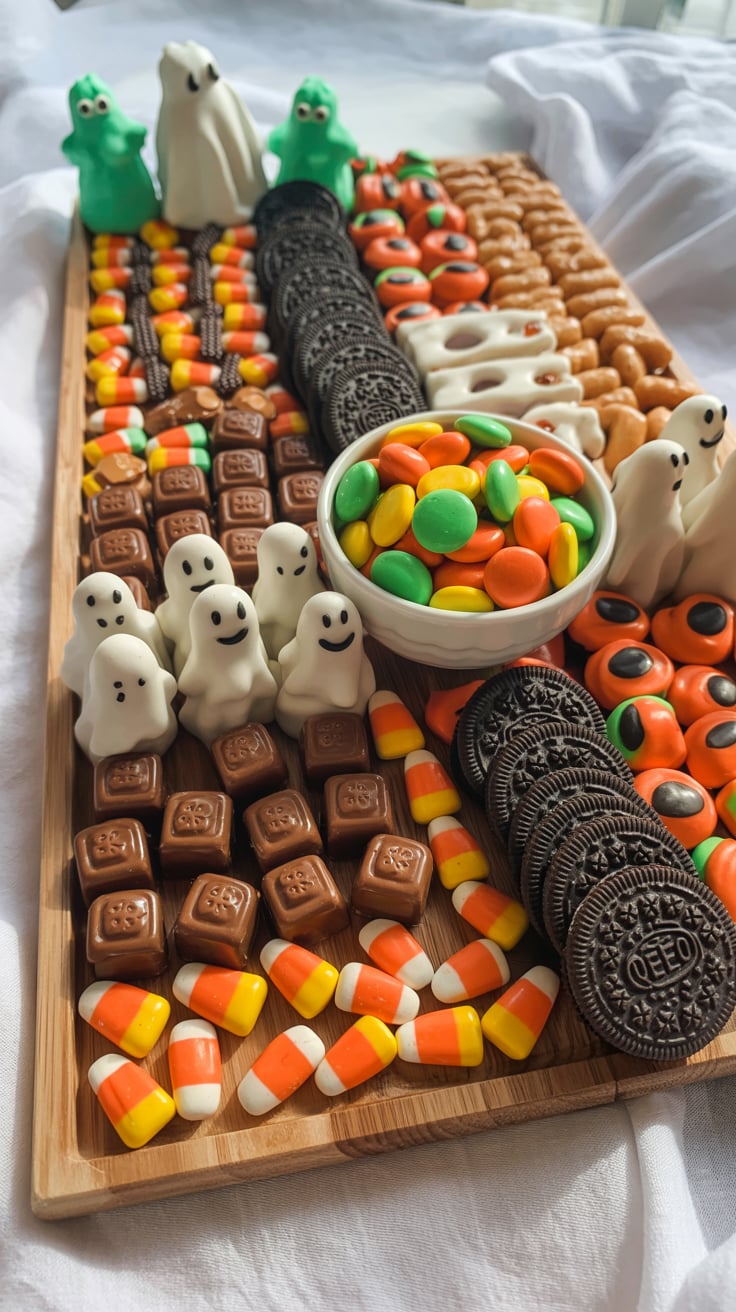 Kids come for the candy, so lean in with a full buffet. Use glass apothecary jars, fill them with a variety pack, and give kids orange & black treat bags plus mini metal scoops. Label jars with funny names like “Zombie Brains” (gummy worms). It’s décor and dessert in one.