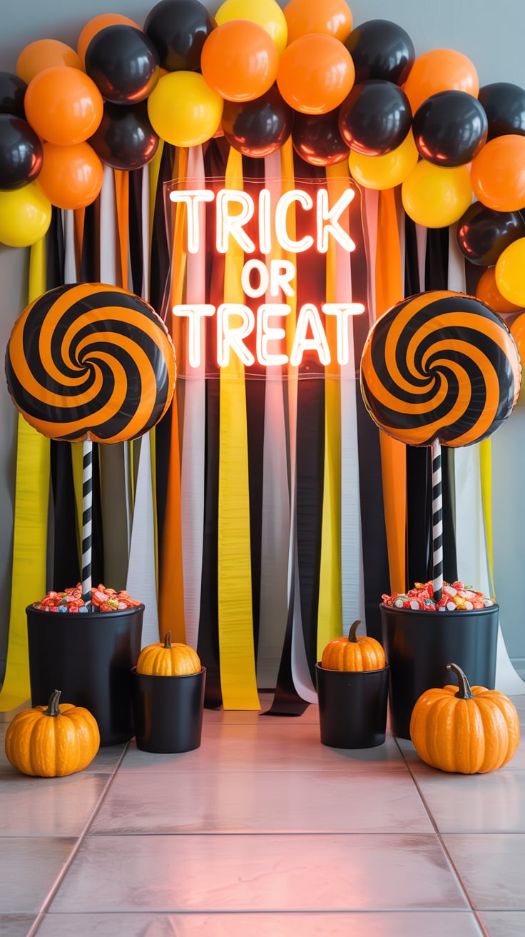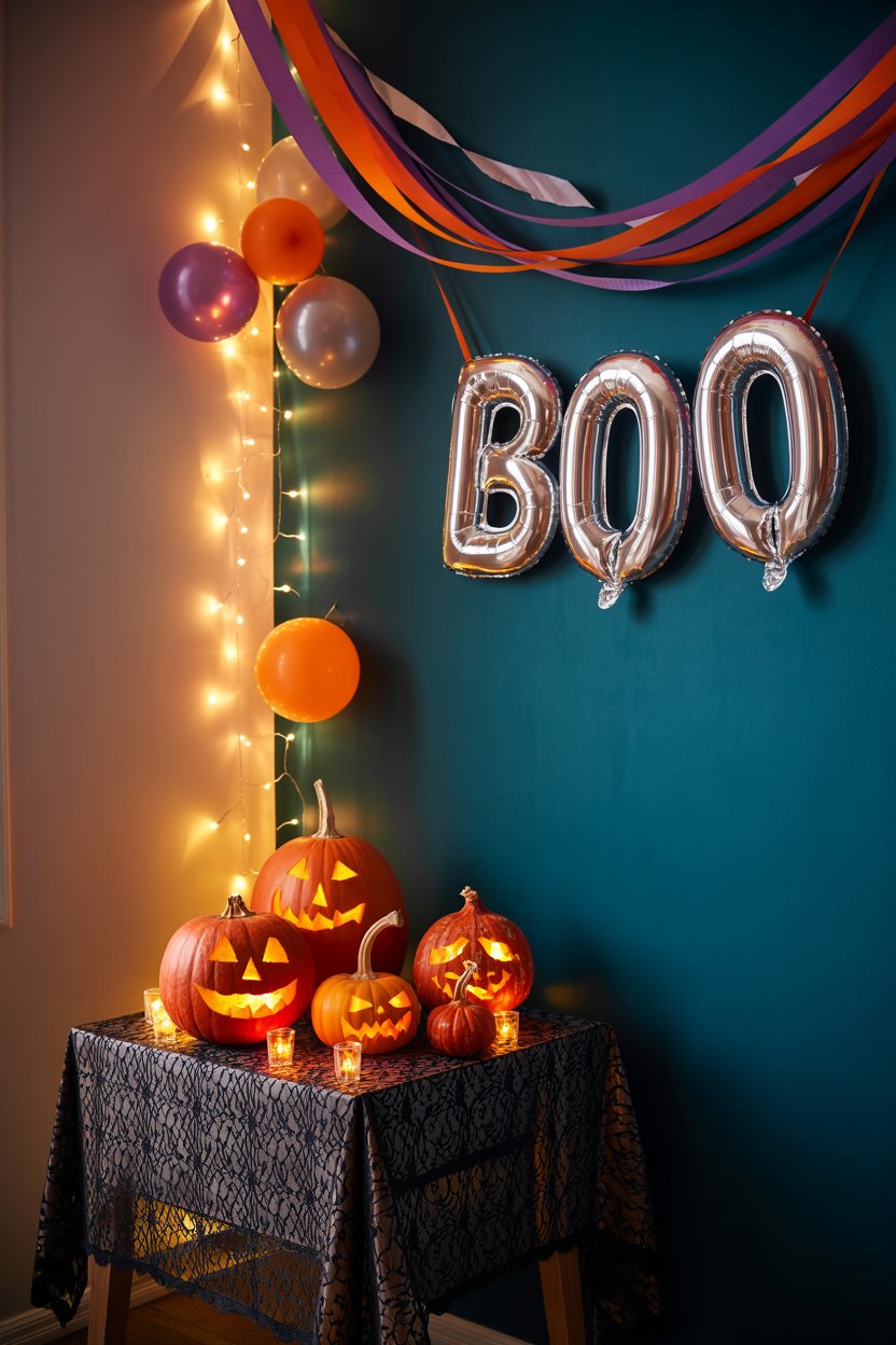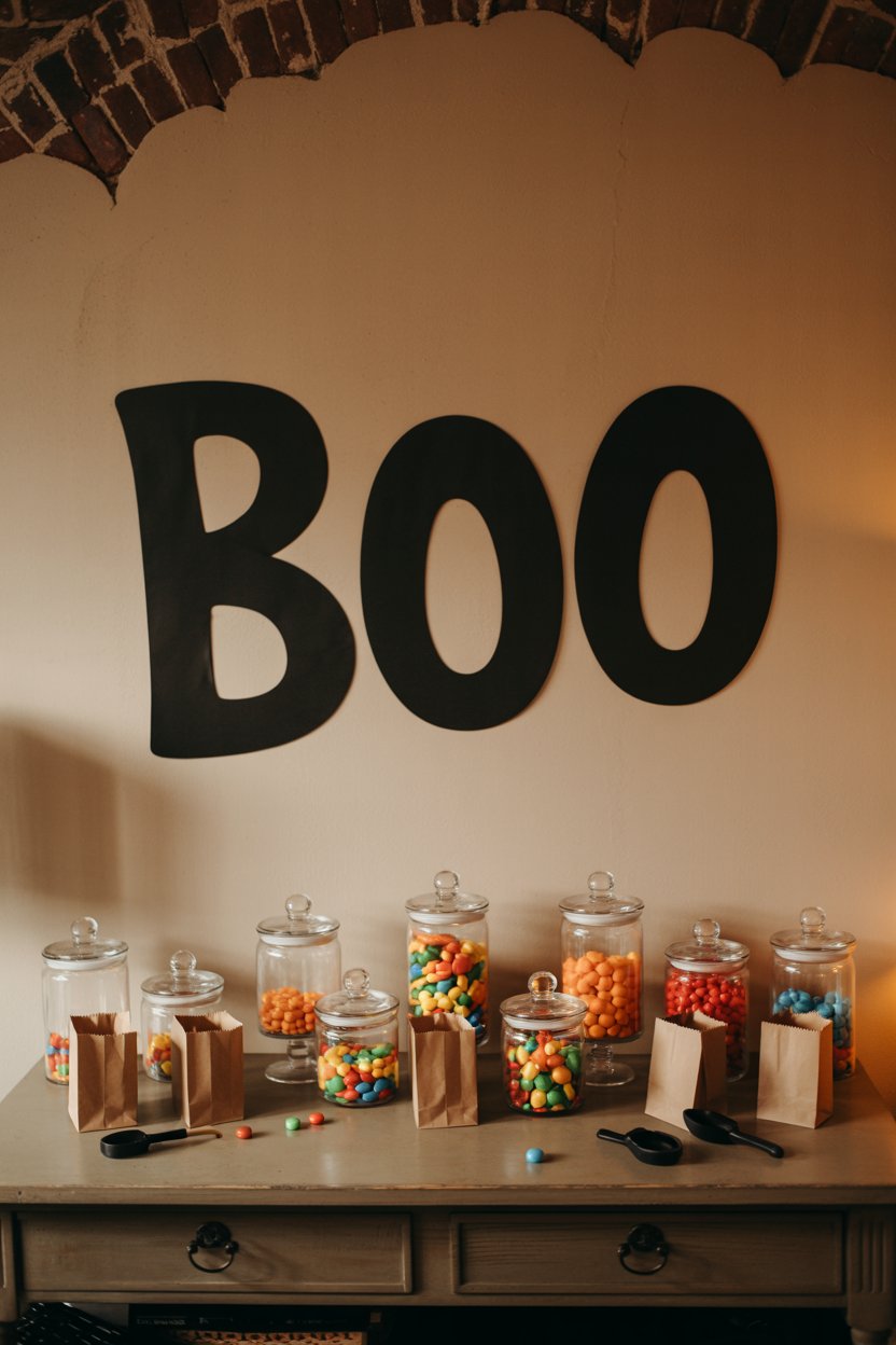 Kids love a giant BOO wall, especially when it doubles as a candy station. Stick oversized silver balloon letters or glowing marquee letters on a wall, then line up clear candy jars filled with a Halloween candy mix. Add scoops, labels, and paper bags so kids can build their own treat bag. Balance the table with pumpkins or a mini banner for that polished look. Pro move: add one salty jar (pretzels or popcorn) so it’s not a sugar overload.