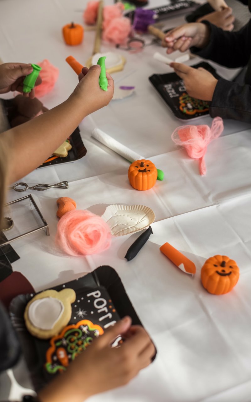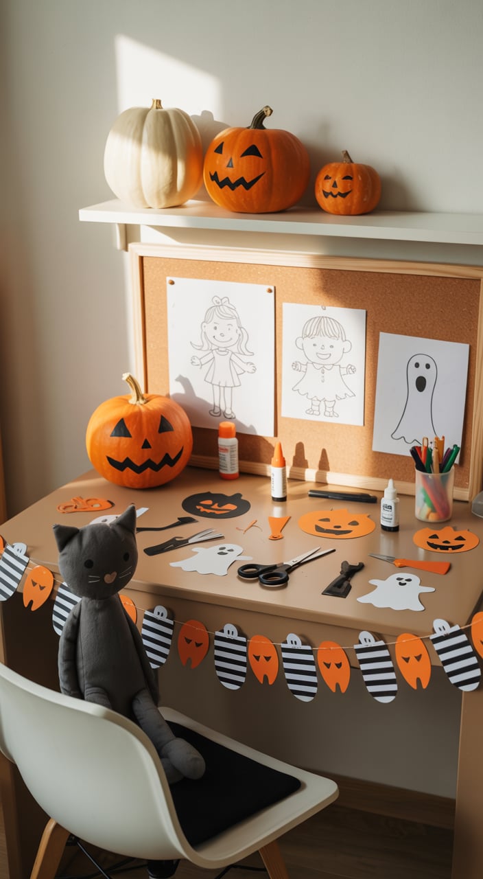 Give kids a calmer activity with a craft corner. Stock up on a Halloween craft kit, plenty of googly eyes, and foam sheets. Projects like ghost garlands or spider crowns are easy hits, and a disposable tablecloth makes cleanup simple. Pro move: pre-cut shapes for little kids so they can just glue and decorate.
