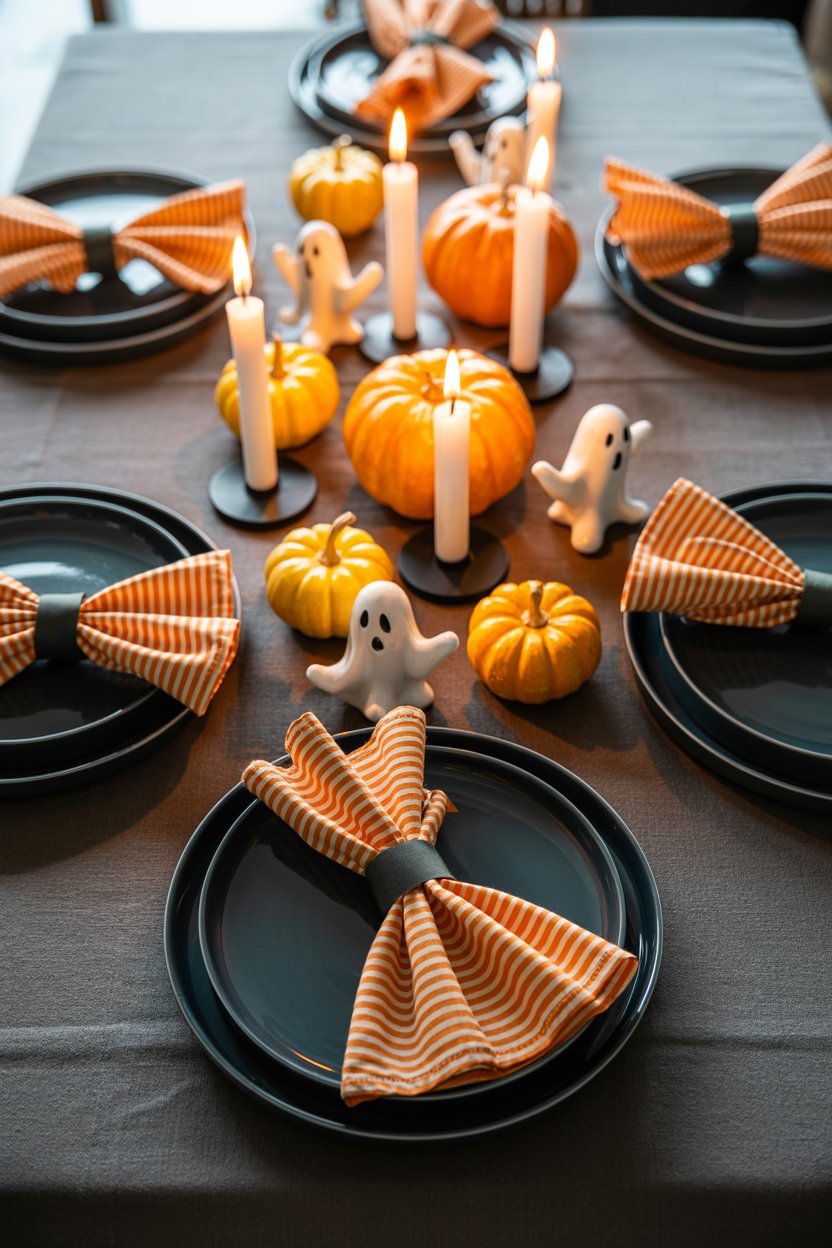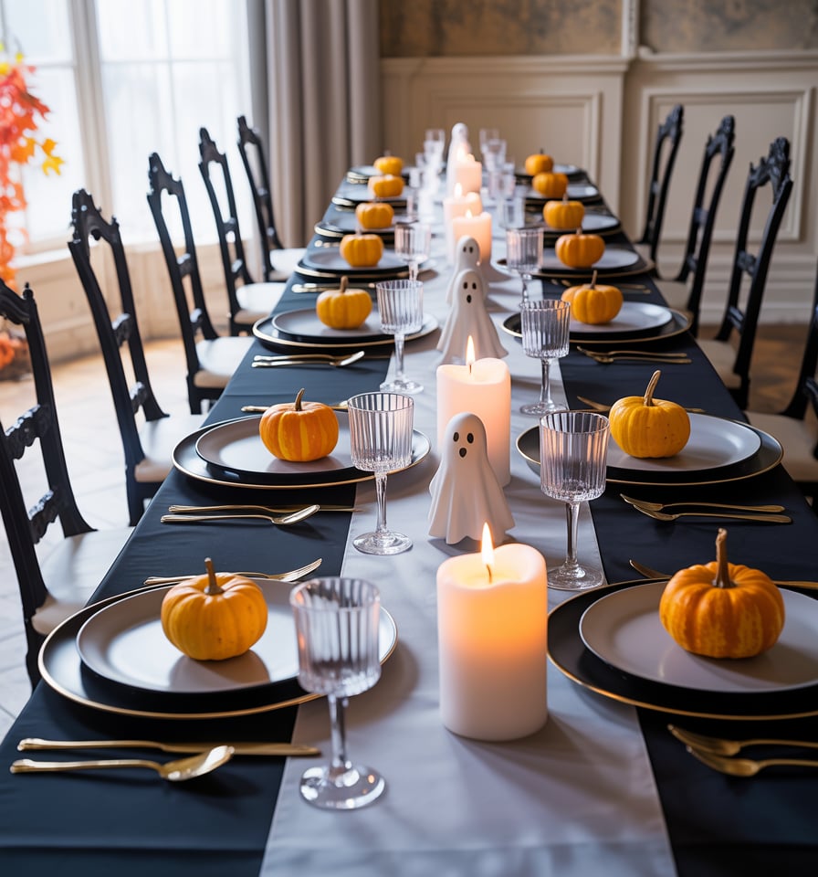 Go graphic and cheap-chic: lay a solid black runner, set black plates (PULOTE 100-pc set or upgraded Bonjour Fête 10.75″), add a ghost accent on each setting with ghost-shape paper plates or tiny glow-in-the-dark mini ghost figurines, then center the table with mini pumpkins and flameless tapers. Keep the palette tight (black + white with one accent) and you’ll get “styled shoot” vibes without effort. Pro move: tie a name tag to each mini ghost and use it as a place card—cute, functional, zero arguing over seats. Skip heavy patterns or metallic plates; reflections and visual noise kill the minimal, spooky look.