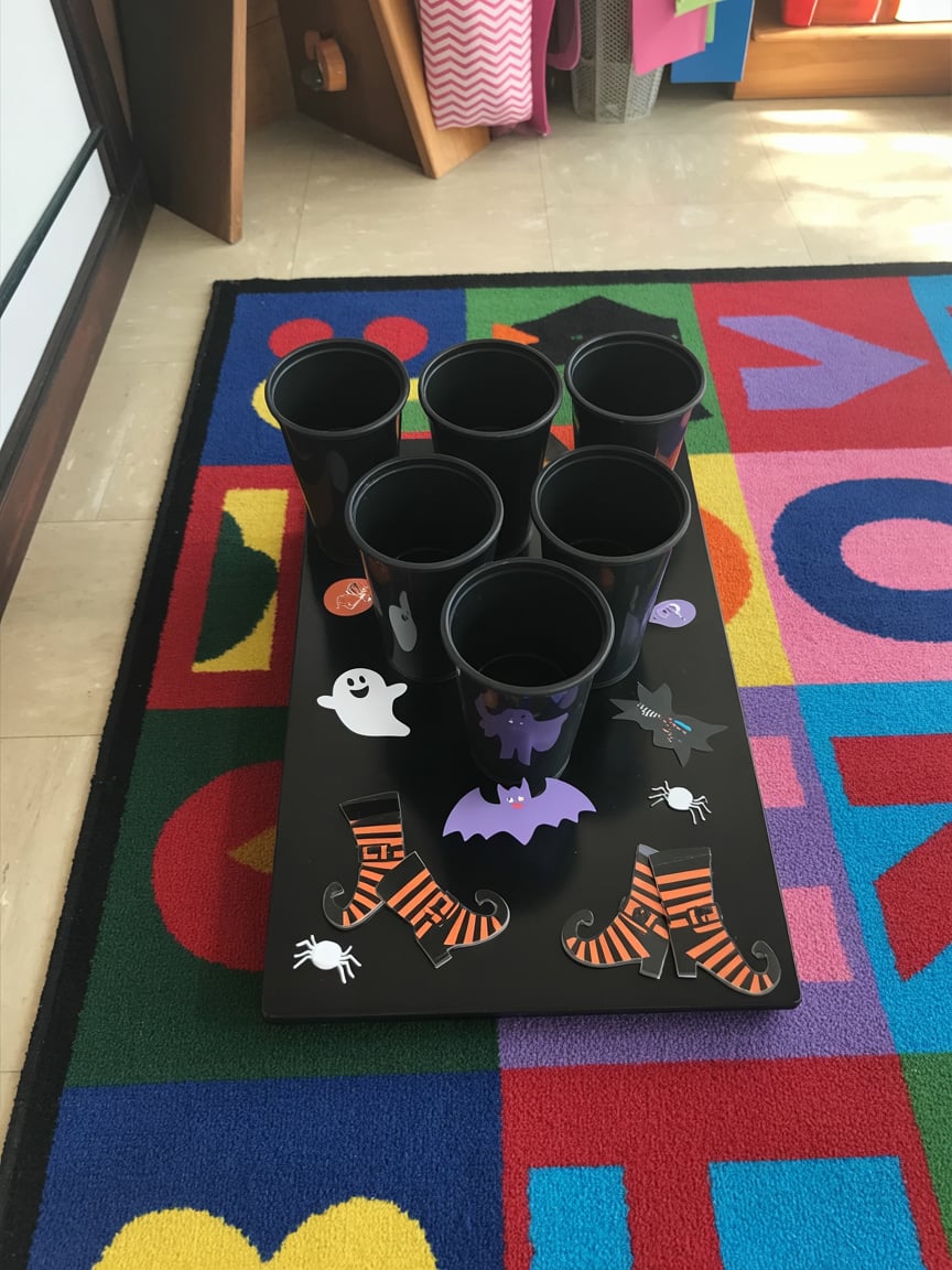 Turn bowling spooky with ghost pins and pumpkin balls. Paint empty 2-liter bottles with goofy ghost faces, line them up like pins, and let kids roll mini pumpkins to knock them down. Imperfect bottles and dented pumpkins make it even funnier. Pro move: keep score with a chalkboard for a mini tournament.