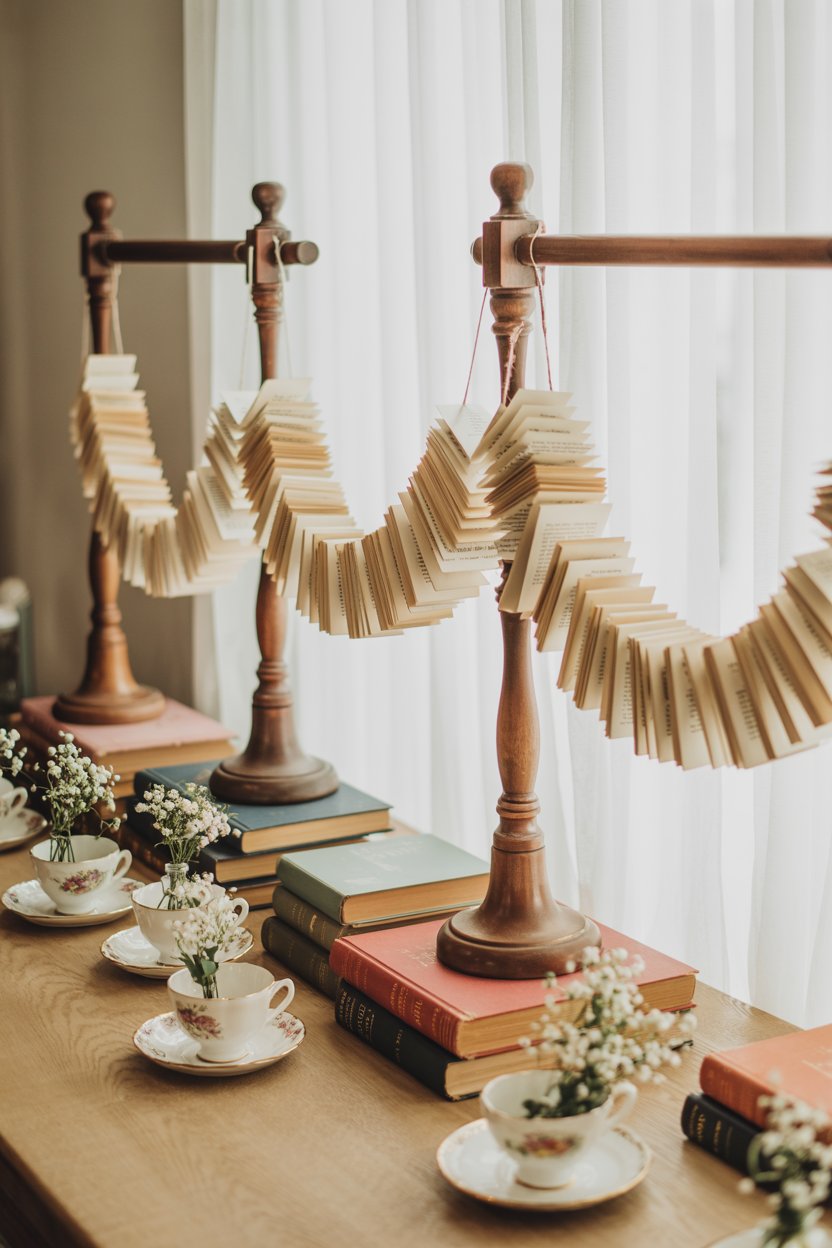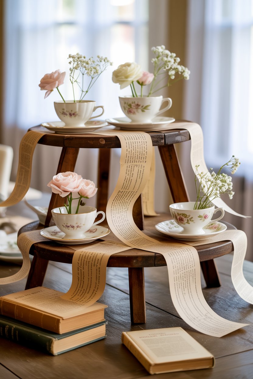 - Centerpieces: Stacked books topped with teacups and florals.