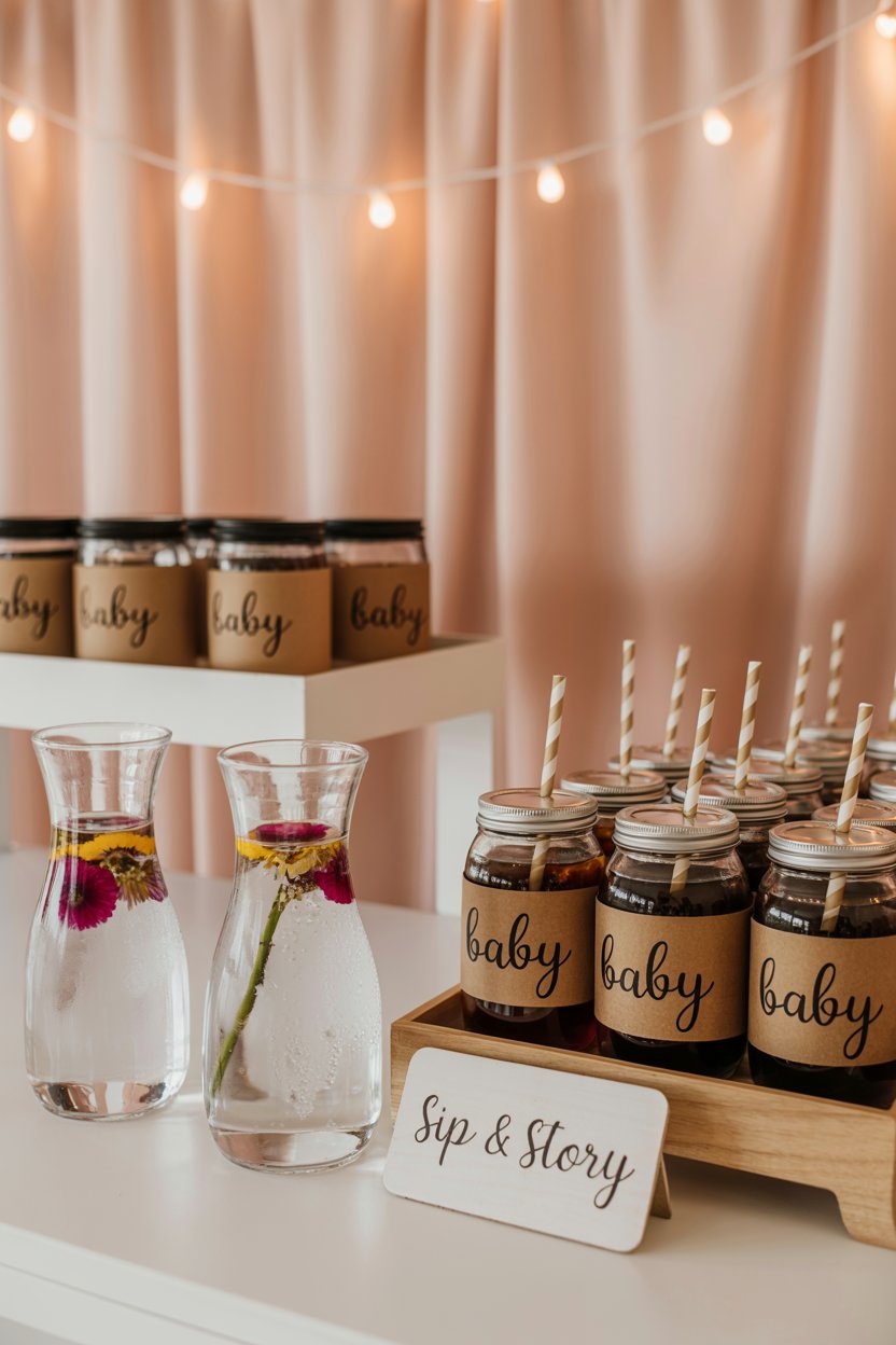 - Coffee & Tea Bar → Custom kraft sleeves stamped BABY. Guests love it.