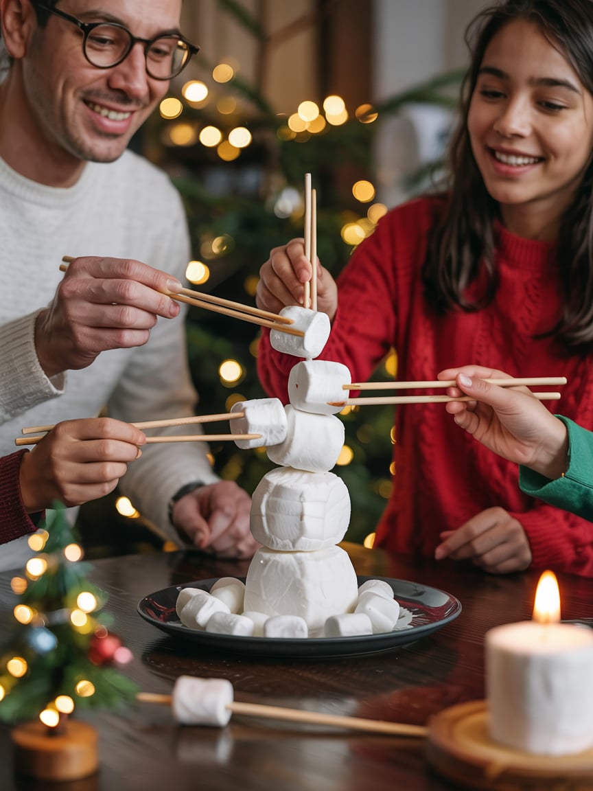 It’s harder than it looks — and 100% more hilarious. Marshmallows flying. Chopsticks snapping. Grown adults concentrating like they’re defusing a snowman-shaped bomb. It’s tremendous.