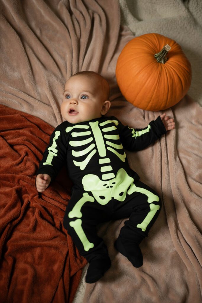 Want genius? Get the baby skeleton pajamas. They glow in the dark (huge hit with siblings), they’re soft enough to sleep in, and they pull double duty as everyday sleepwear after Halloween. Practical, fun, and spooky without scaring Grandma. Grab glow-in-the-dark skeleton PJs.