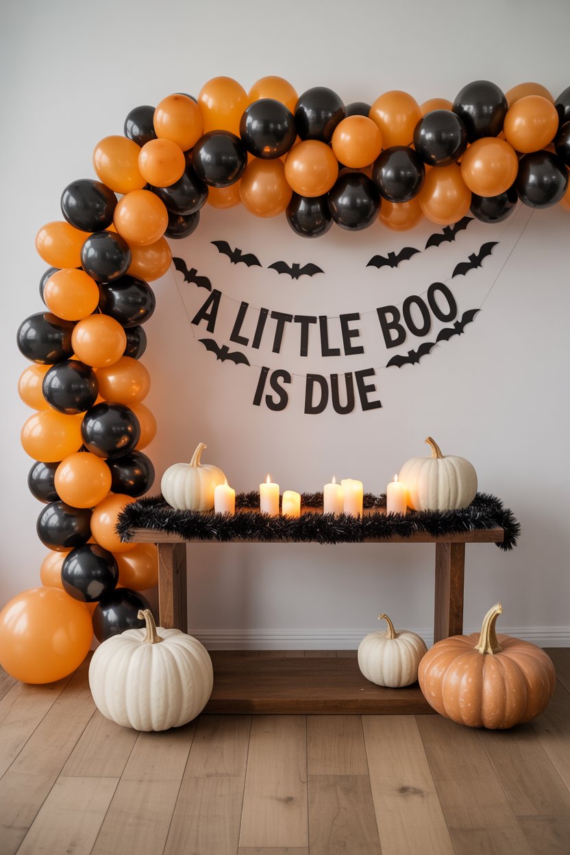Photo moment: A black-and-orange balloon arch with a letterboard sign reading “A Little Boo Is Due” makes for the cutest keepsake shot.