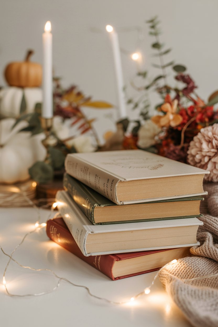 Backdrop: Stack vintage books, slip in gold bookends, and weave soft string lights between the pages for a dreamy glow.