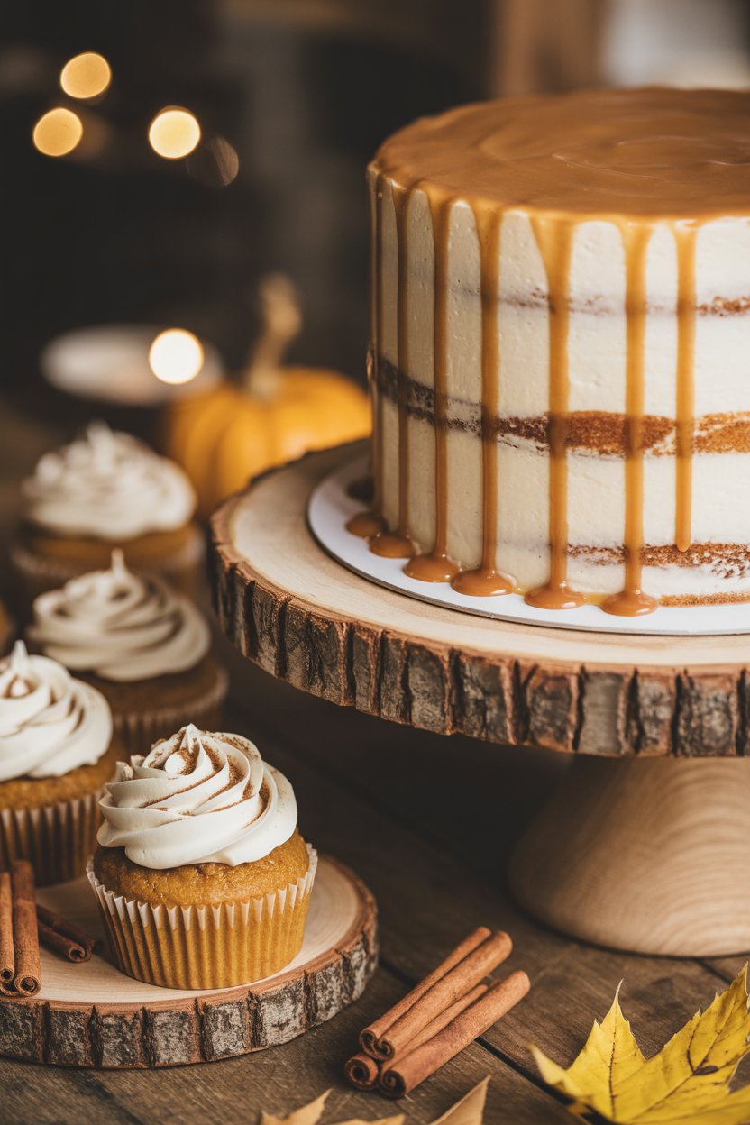 - Cupcake Towers: Stack tiers of spiced cupcakes topped with cinnamon buttercream. Use a rustic wood cupcake stand to tie in the fall vibe.