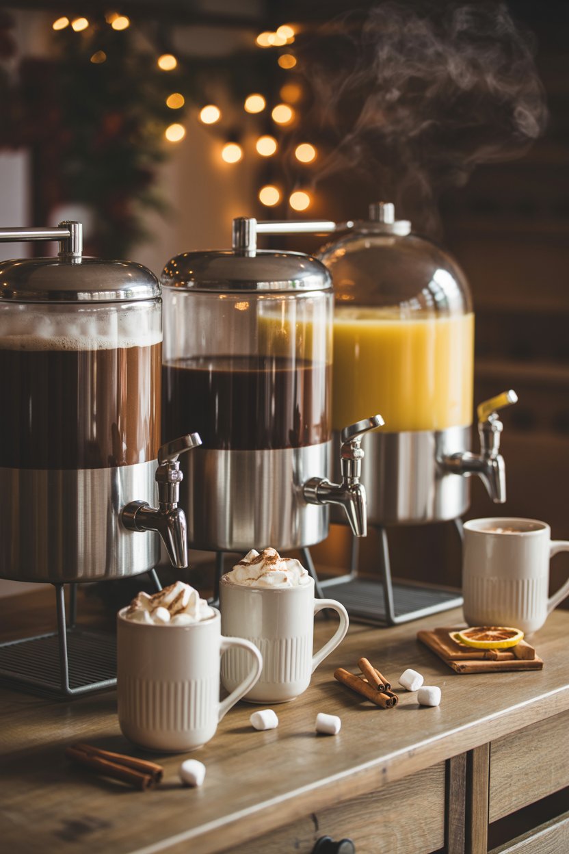 - Hot Cocoa & Cider Station: Offer cocoa with toppings (whipped cream, mini marshmallows, crushed peppermint) and spiced apple cider. Keep everything hot in insulated drink dispensers and serve in lidded cups.