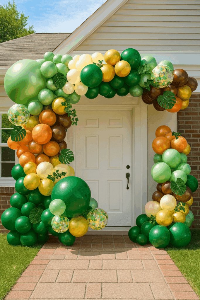 - Mix jungle greens, warm golds, and a few animal-print balloons for depth.