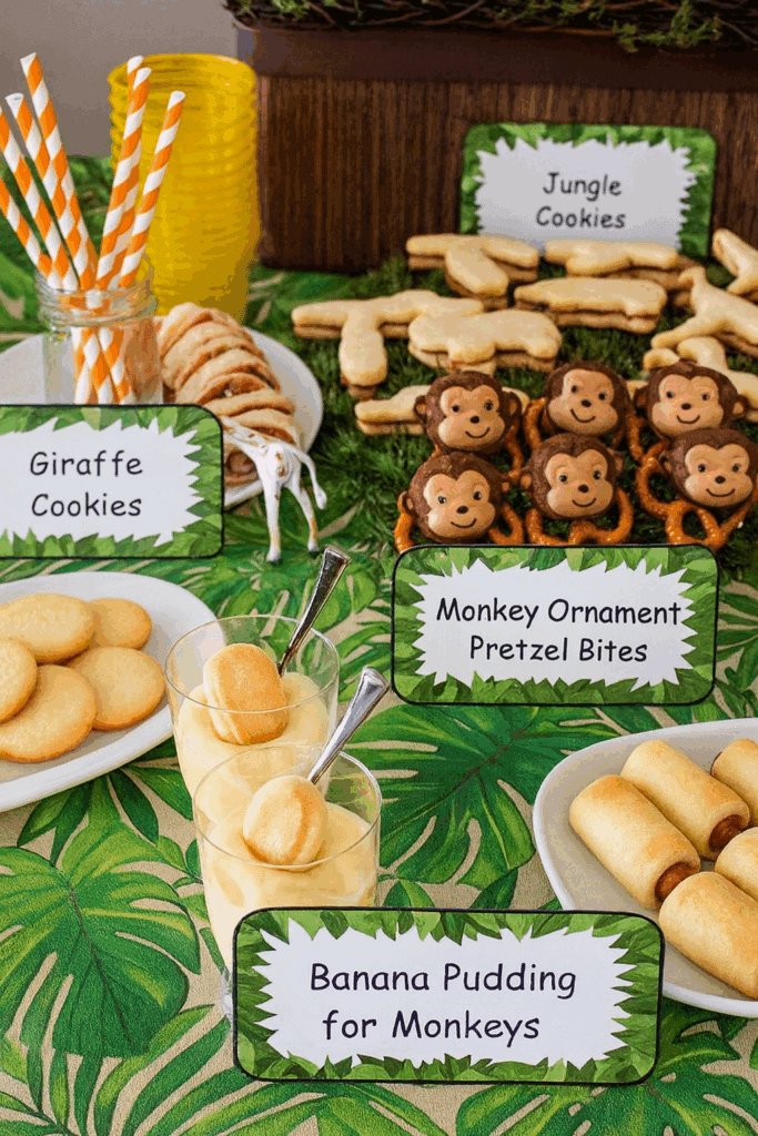 Time for the crowd-pleaser—the food table. With a safari theme, even simple snacks look styled. Rename a few items, add leafy touches, and you’ve got a spread that feels catered without the invoice.