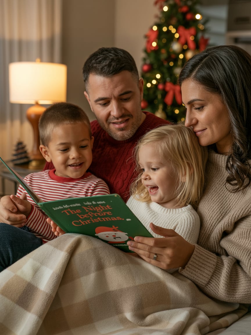 Right before everyone dives into the gift pile, take a breath. Grab cocoa, pile on the couch, and read something festive together. It sets the tone — warm, cozy, connected.