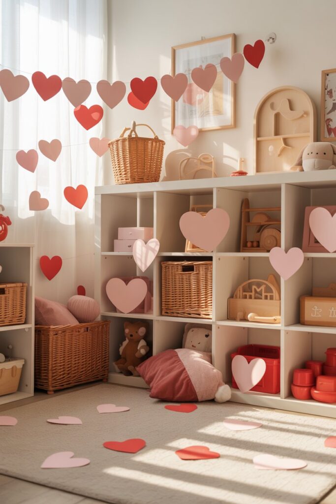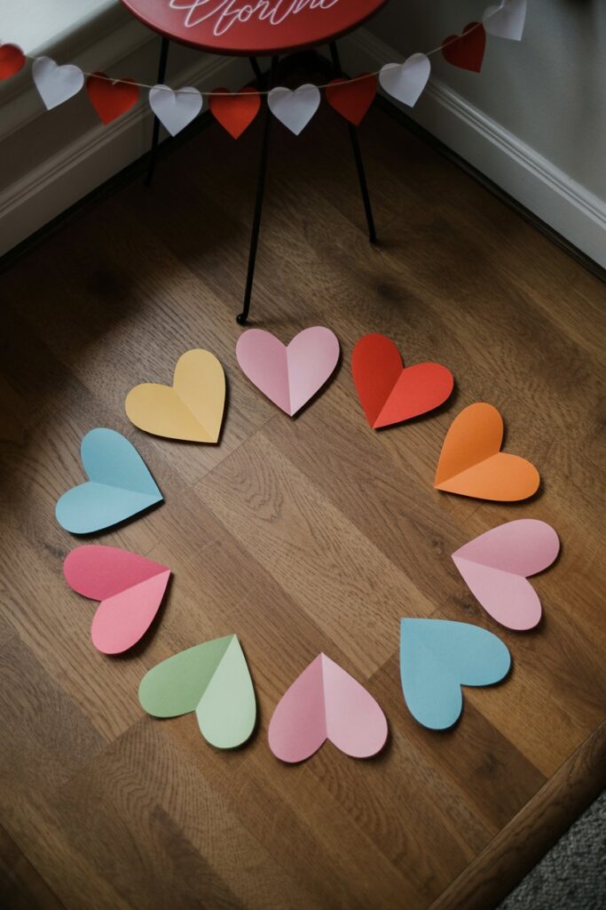 Create a hopscotch path using paper hearts instead of chalk squares. Kids hop through the pattern while practicing coordination and balance. Foam hearts or non-slip paper versions make this safe and easy to set up indoors.